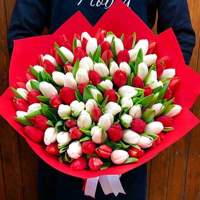 Сочный букет из белых и красных тюльпанов в яркой упаковке с атласными лентами.
