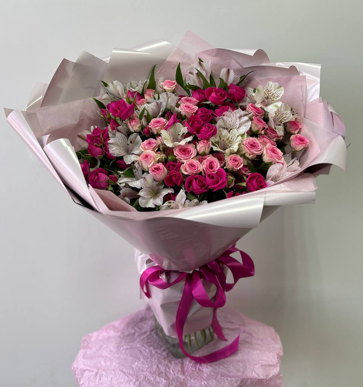 7 кустовых розовых роз,7 кустовых малиновых роз, 9 белой альстромерии