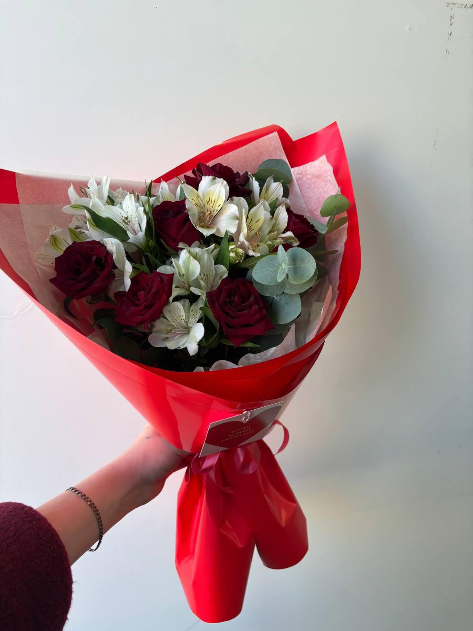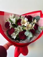 букет из 7 роз краных и 3шт веточки кустовой белой альстромерии