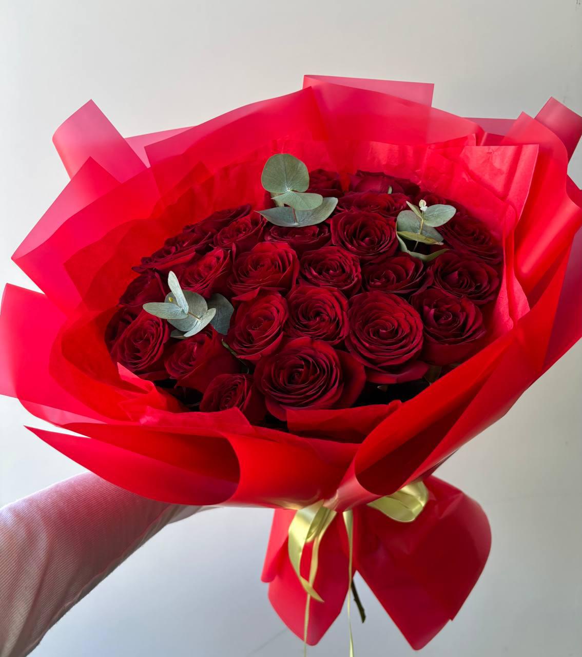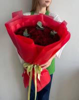букет из красной рохзы с добавлением эвкалипта упаковка возможна на выбор